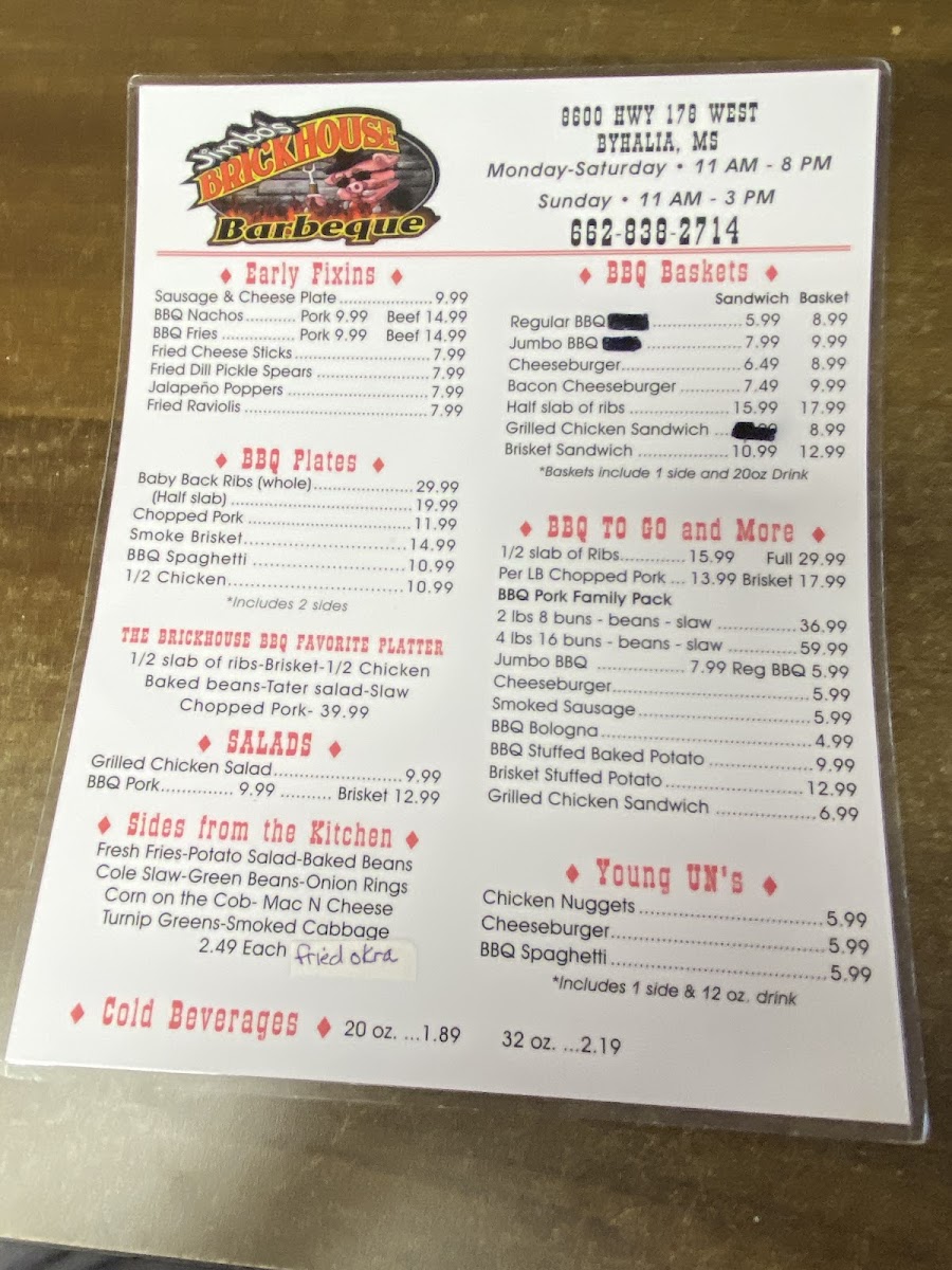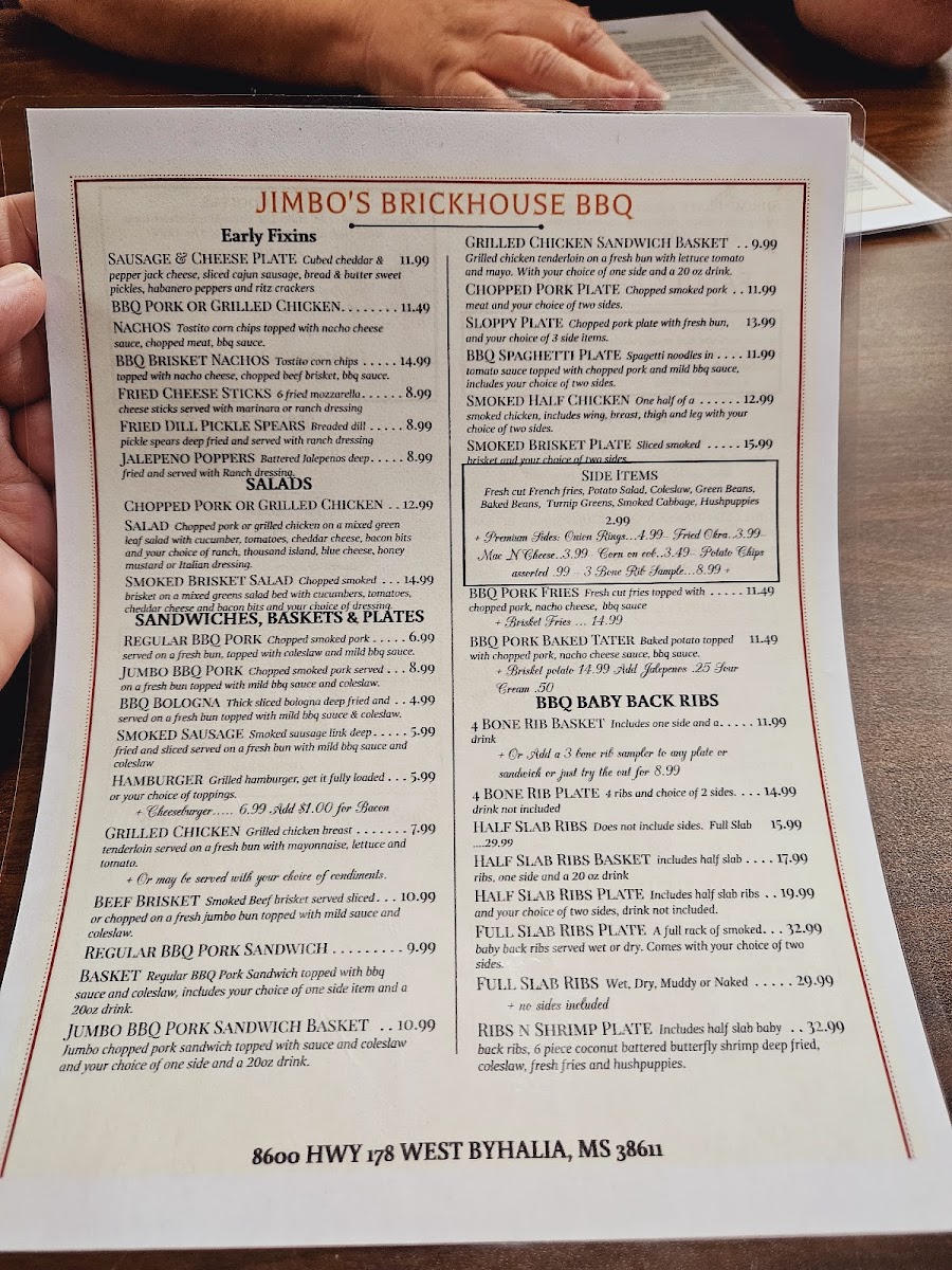 The Early Fixins section offers a variety of appetizers such as the BBQ Nachos, BBQ Fries, and Fried Cheese Sticks. Additionally, the BBQ Baskets include favorites like the Jumbo BBQ and Bacon Cheeseburger. With so many options across all categories, Jimbo’s Brickhouse Barbeque is sure to satisfy any appetite.