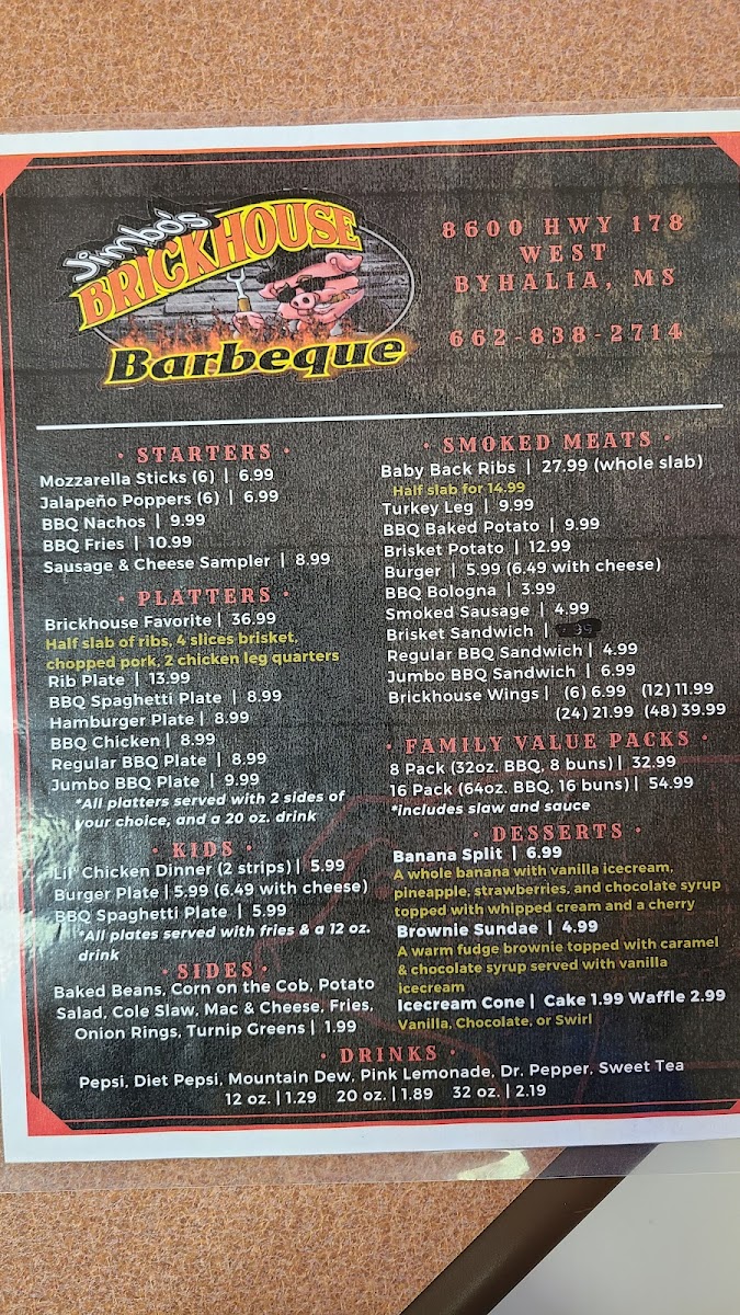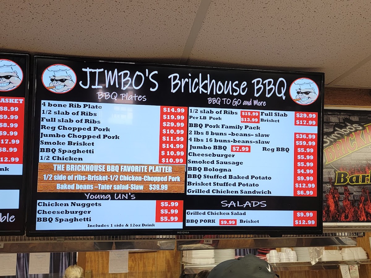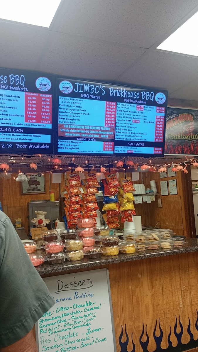 Jimbo's Brickhouse Barbeque offers a diverse and mouthwatering menu that caters to a variety of tastes. For starters, you can enjoy Mozzarella Sticks or Jalapeño Poppers, or dive into the savory BBQ Nachos and BBQ Fries. Their platters feature hearty options like the Brickhouse Favorite, Rib Plate, and BBQ Spaghetti Plate. You can also opt for a classic Hamburger Plate or BBQ Chicken. The sides are perfect complements, including Baked Beans, Corn on the Cob, and creamy Mac & Cheese. For those craving smoked meats, there are options like Baby Back Ribs, Brisket Potato, and BBQ Bologna.